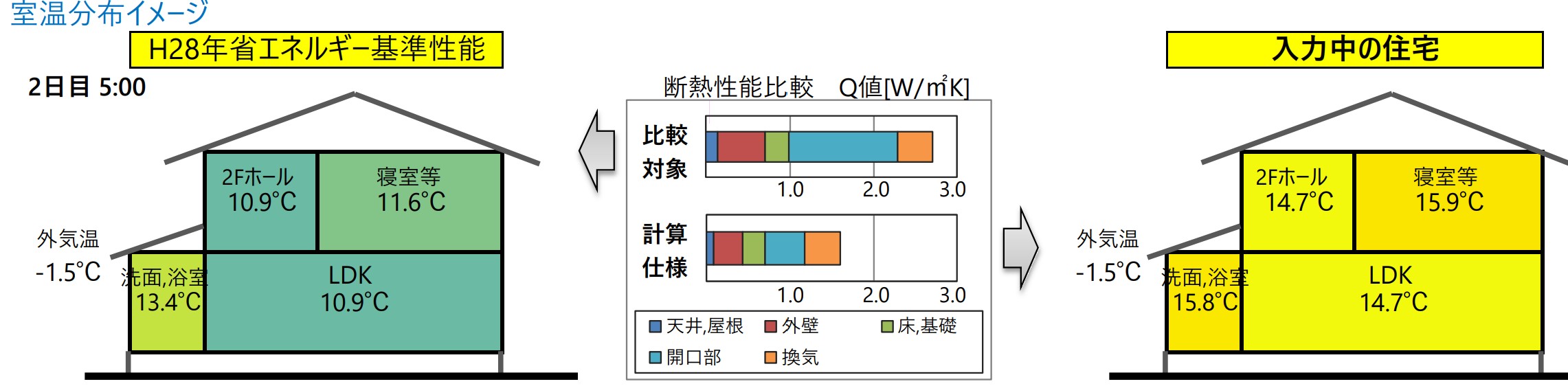 - 冬季室温予測で、6:00~23:00まで暖房し、その後停止したときに外気温がー1.5℃のときの翌朝5:00の各室温予測